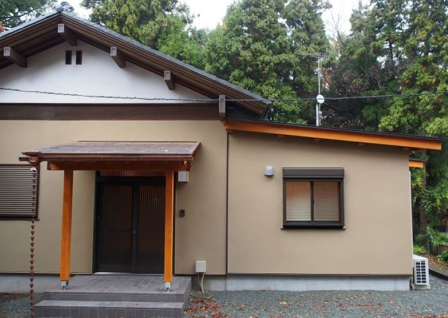 西側の外観、右側の片流れの屋根が増築部分。玄関の位置が変更され、玄関ポーチは木部表しの表現となっている。