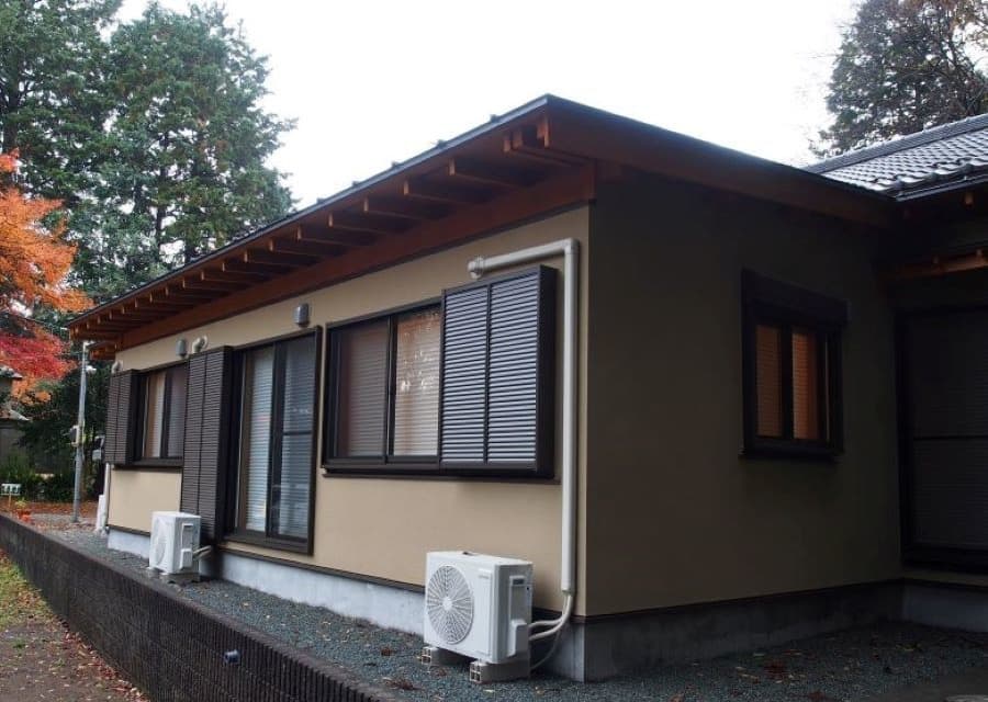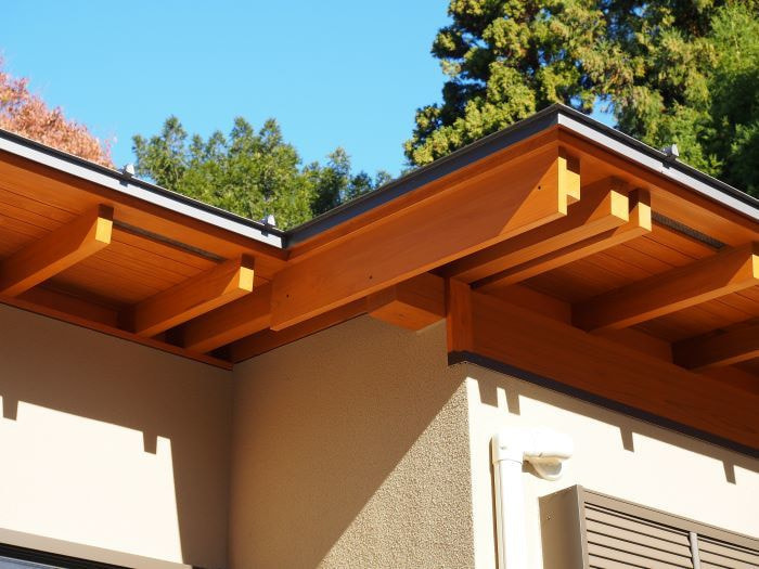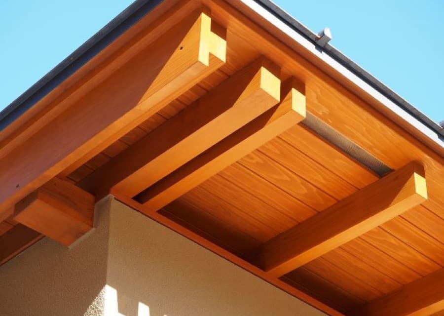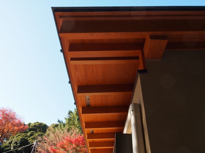 木部が表しとなった軒先。木材保護塗料が施された杉の垂木と軒天が見える。木の軒裏は、翳(かげ)を生んで建物全体が落ち着いた佇まいになります。
