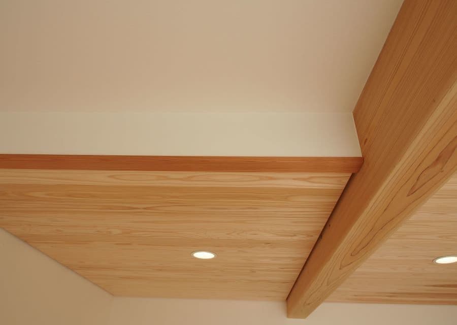 天井と表しの大梁の詳細。天井は、天竜(静岡)産、大梁は、丹沢(神奈川)産、天井高さを見切っている造作材は、吉野(奈良)産、それぞれの特性を活かした杉の空間。こういったアンサンブルもデザインのひとつ。