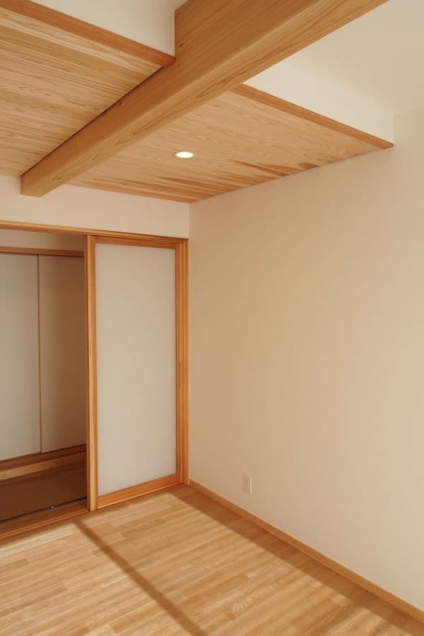 6畳のフリースペース。杉の大梁が、表しとなっている。杉が張ってある天井は、高さ2m25cm。床は、ナラの無垢材にオイル仕上げ。壁は、紙クロスに粘土塗料の自然素材の仕上げ。造作材は、吉野杉。