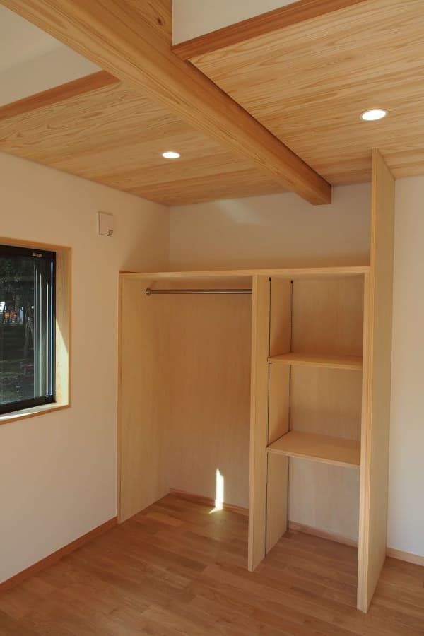 子供部屋の造り付けの収納。大工の手による榀合板の造作家具。棚は、棚柱で可動できるようになっている。