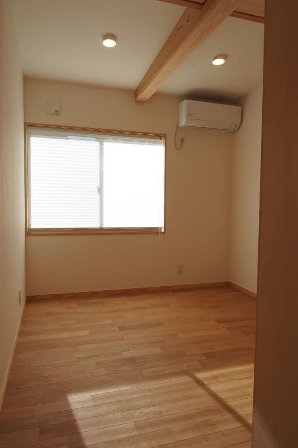 6畳の子供部屋。窓側の天井半分は、屋根に合わせた勾配天井となっていて、天井の仕上げを壁と同じにして、窓から入った光が反射しやすくしてある。勾配天井の高さは、2m25cm~2m40cmとなっていて、杉板の平天井部分と合わせて、変化のある室内となっている。
