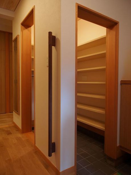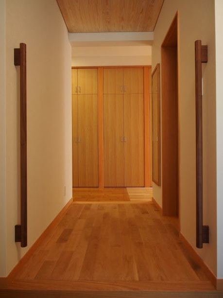 玄関の見返し。玄関框の両脇には手すりを設けた。ウォールナット材を八角形に加工して握りやすくしてある。落ち着いた雰囲気の玄関となった。
