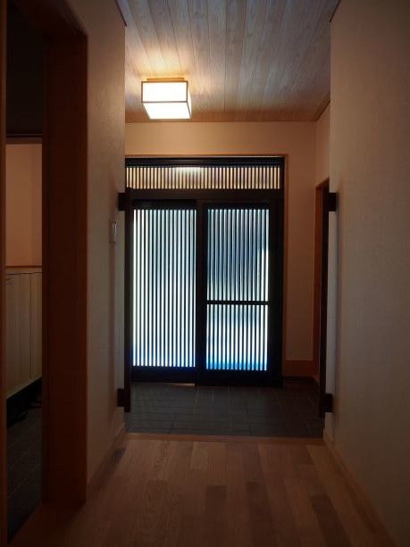 玄関から既存建物の廊下方向を見る。新しい玄関は、既存建物の一部を改装して位置を変えて計画した。また、既存建物の廊下には造作収納が増設されて、以前より充実した収納計画となった。