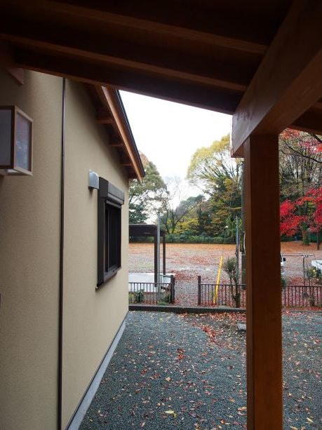 玄関ポーチからの眺め。玄関ポーチは、木部が表しになって木の家であることが表現されている。高さもほど良く抑えられていて、家に招かれる印象を持つことができる寸法になっている。