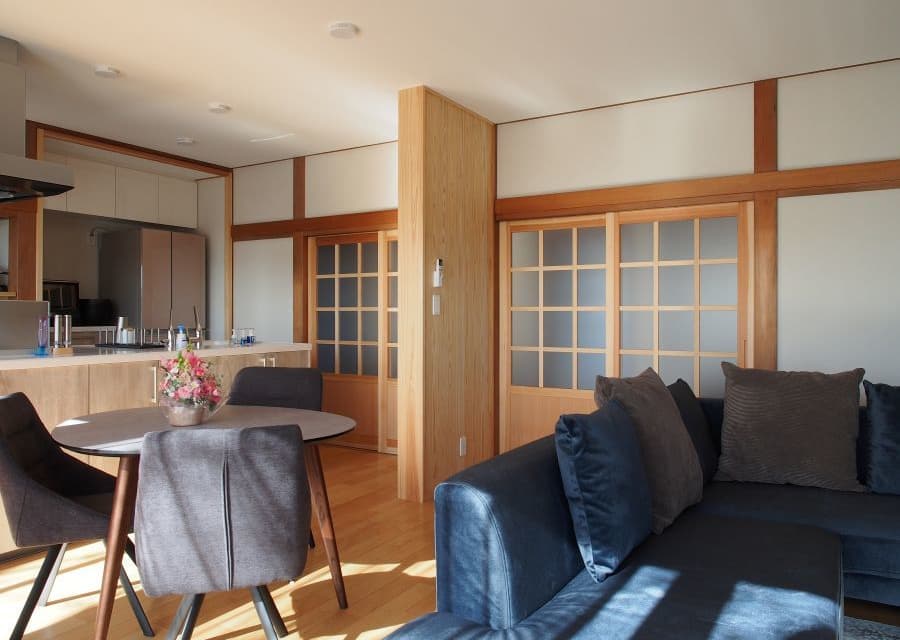 欄間を残すところと、取り払うところを分けることで、LDKの雰囲気を変えることができました。欄間があると光の反射が少し抑えられて落ち着いた雰囲気になります。