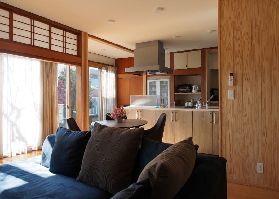 オープンキッチンからの眺め。以前の広縁をLDKの空間に取り込むことで、