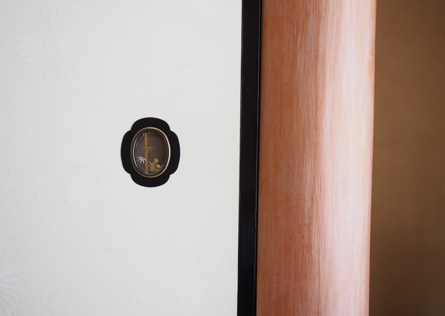 杉のミガキ丸太と黒漆の襖と手掛けの意匠。